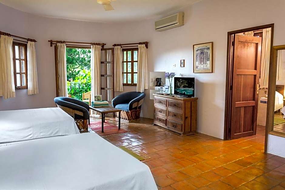 This spacious and bright room features colonial décor in light tones, with wooden furniture and tiled floors. The room has air conditioning, a satellite TV and a furnished balcony overlooking the hotel's gardens. The private bathroom also has a Mexican design, featuring hand-painted tiles.